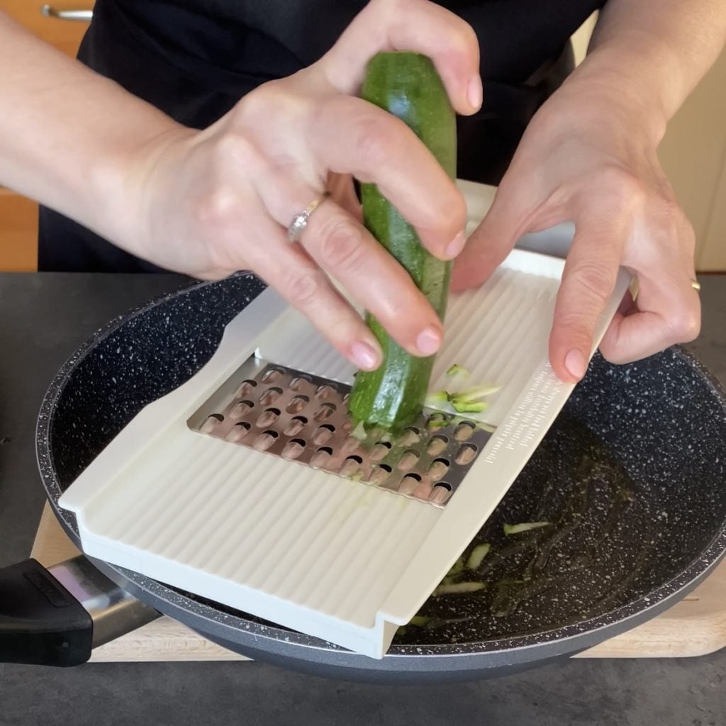 Using a large-holed grater, grate the zucchini directly into the pan.