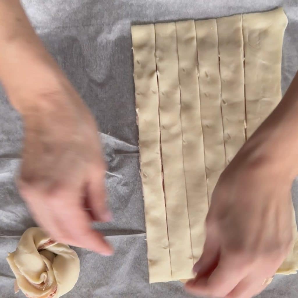 • With a sharp knife, cut the puff pastry into strips about 0.4 inch wide,