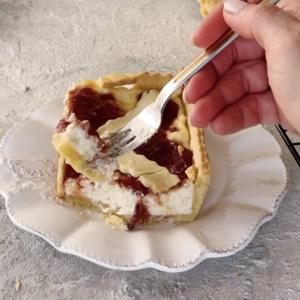 When the ricotta and jam tart is cooked, take it out of the oven and let it cool before cutting and serving.