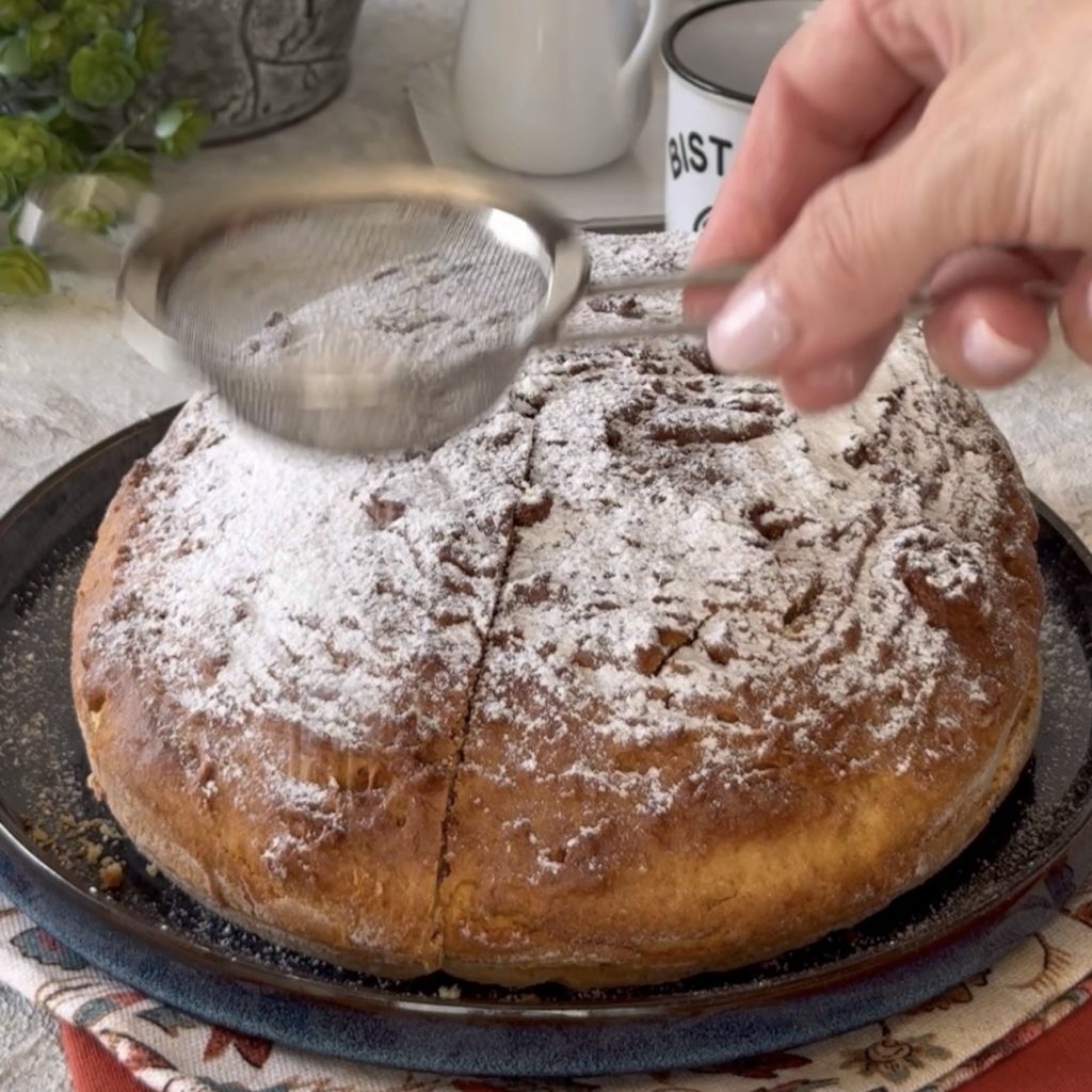 Once baked, remove the pan from the oven, let it cool, remove the cake from the pan, and then dust with confectioners’ sugar
