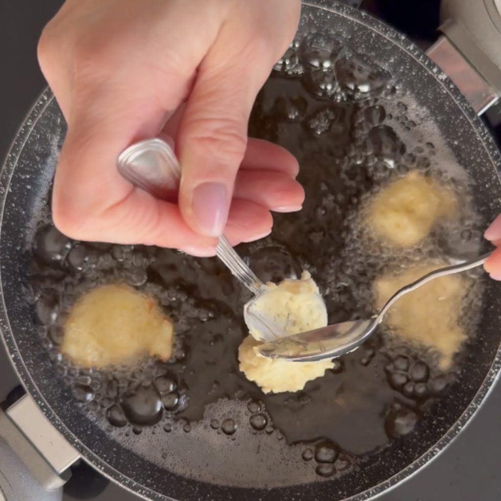 Pour the peanut oil into a pot and heat it to about 340°F. If you don’t have a thermometer, check the oil’s readiness for frying with a wooden spoon. If bubbles form around the handle, the oil is ready to use. Use a teaspoon to scoop the batter and drop it into the hot oil with the help of another spoon. Form more fritters but not too many at once, or you won’t have space to turn them, and they won’t cook evenly.
