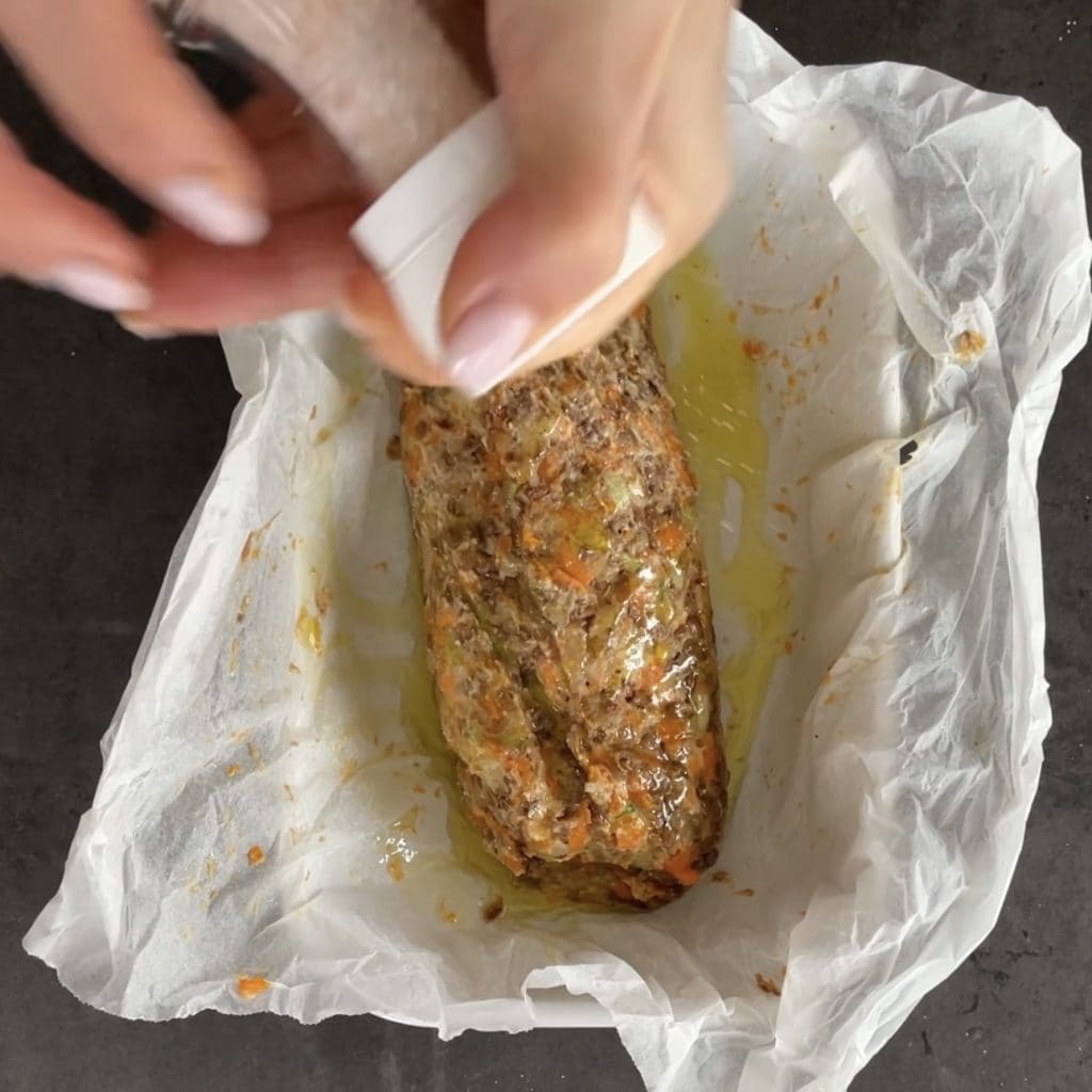 • Take the meatloaf out of the refrigerator, place it in the baking dish, keeping the parchment paper underneath, add some extra virgin olive oil on top,