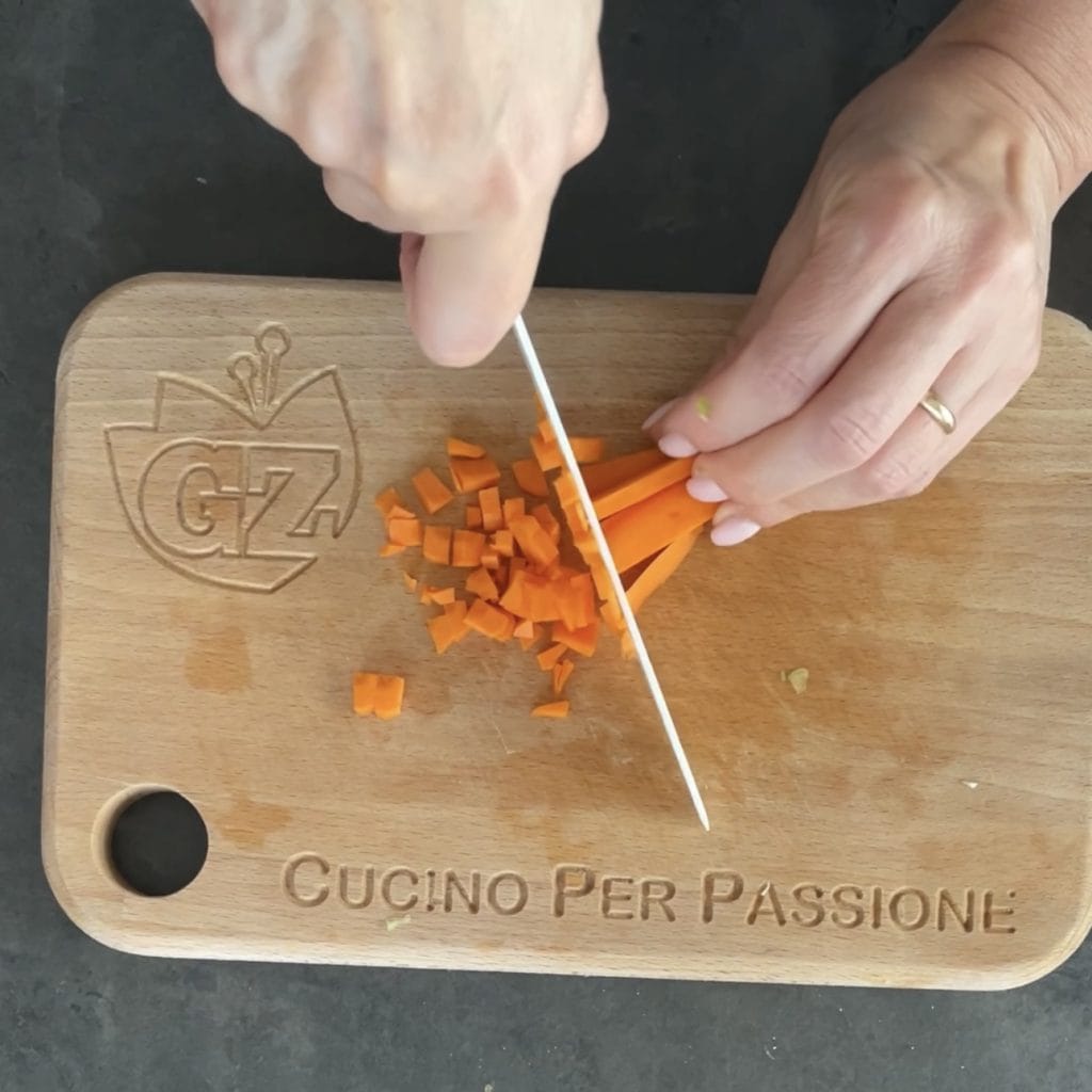 • Let’s start preparing the lentil meatloaf. Cook the lentils in plenty of water; the time varies depending on the type and size of the lentils, so follow the times indicated on the package. Clean the vegetables, boil one carrot, and finely chop the celery stalk.