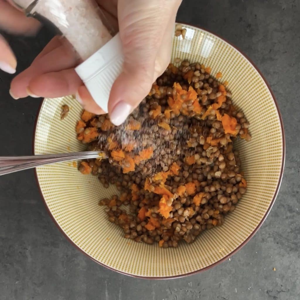 • When the lentils are cooked, drain them, place them in a bowl, add the boiled and mashed carrot,