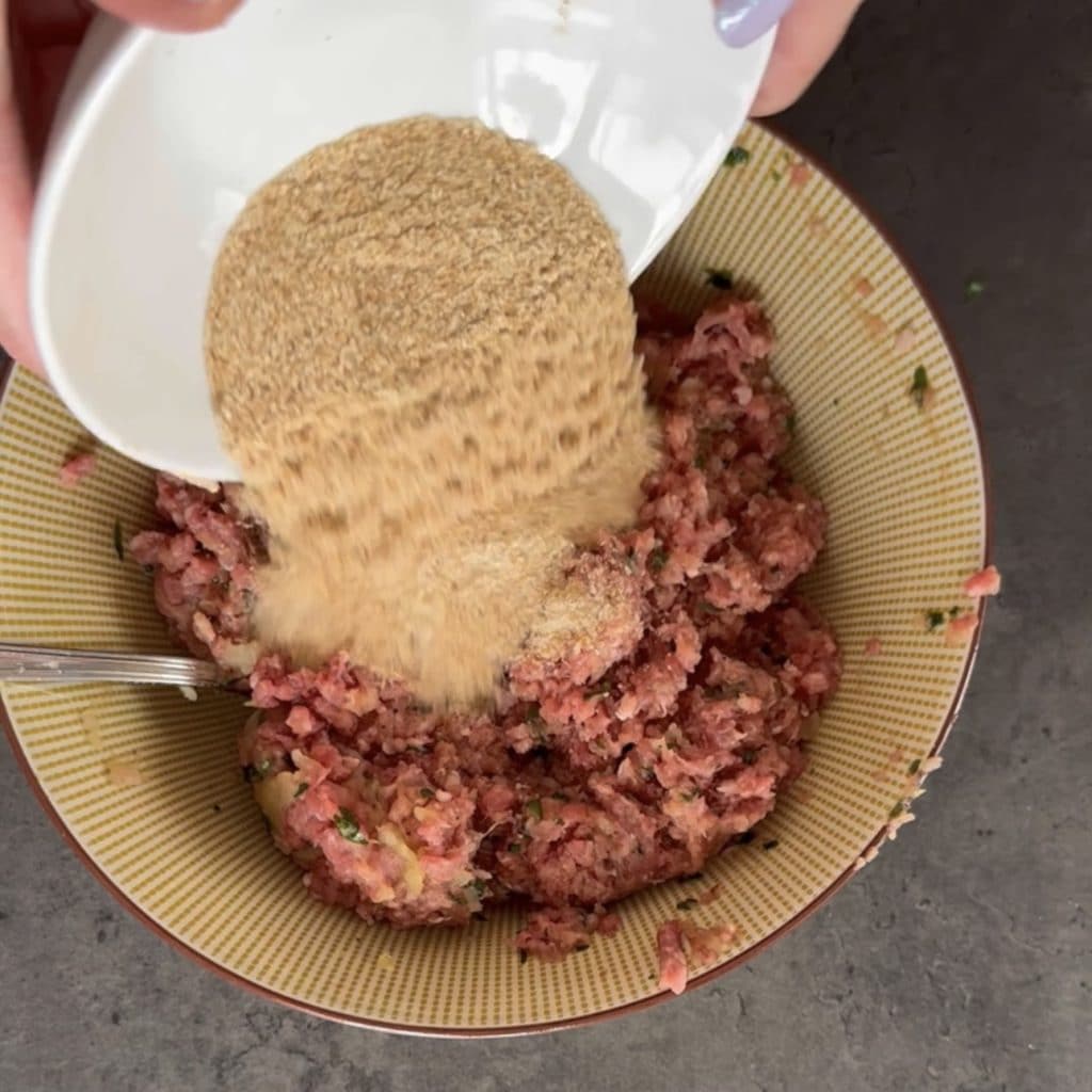 Place the ground meat in a bowl and work it with a fork to break it up. Then add the egg,