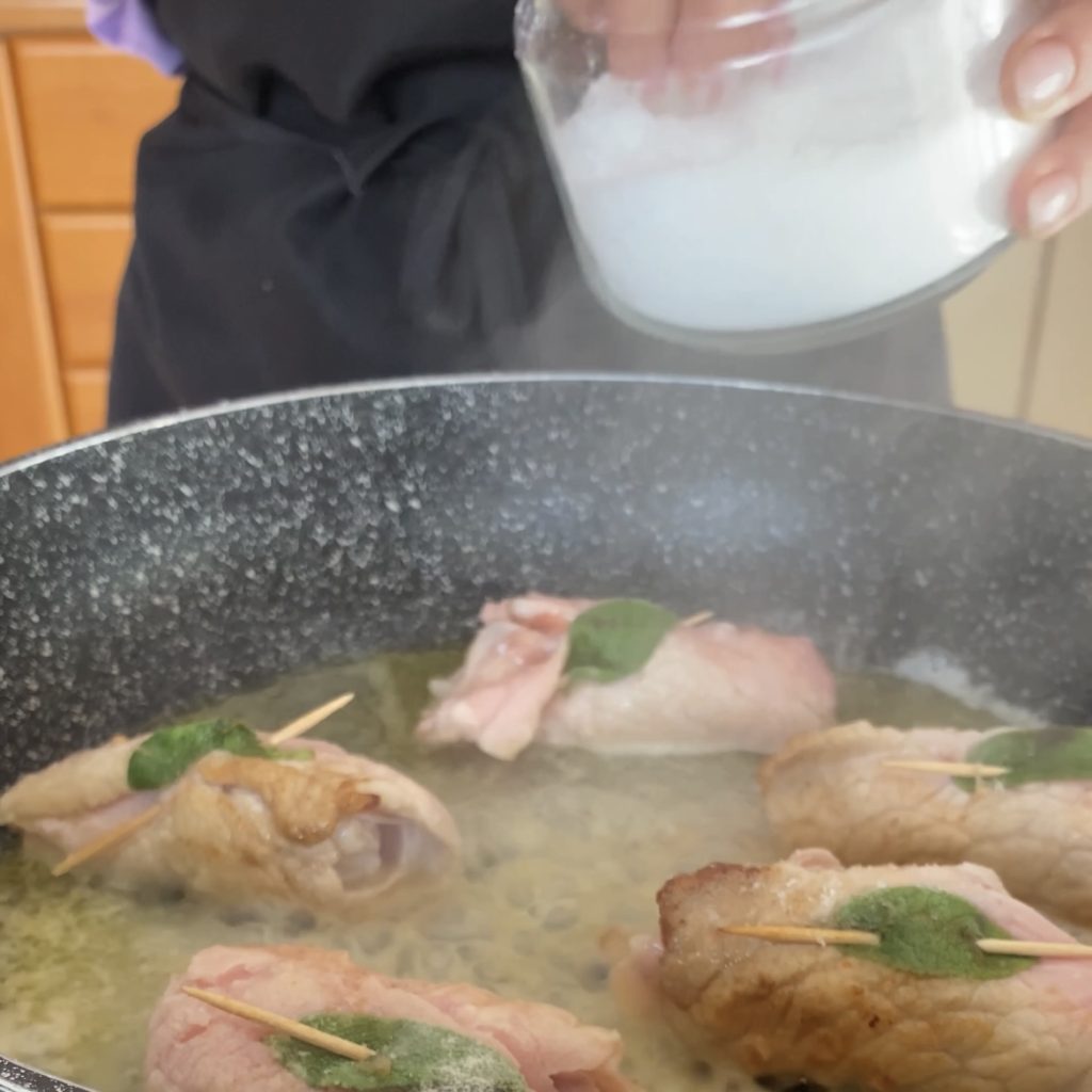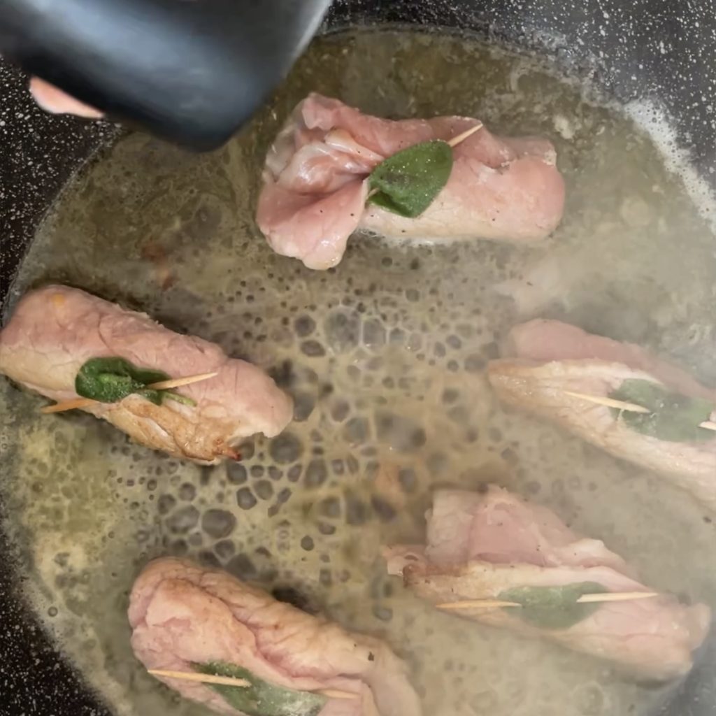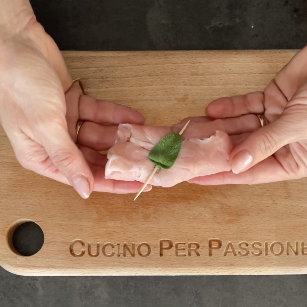 • place a sage leaf on top of the roll and secure the sage and roll with a toothpick and