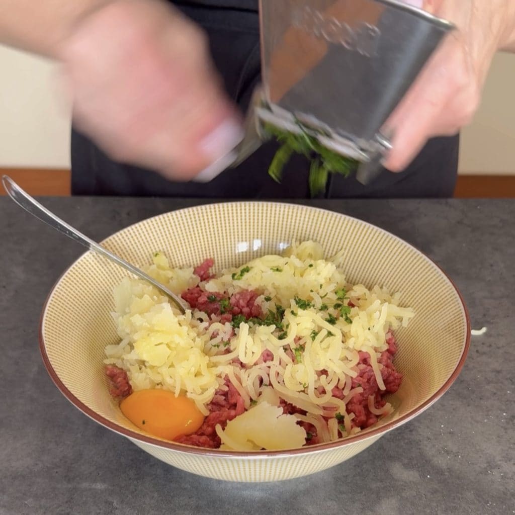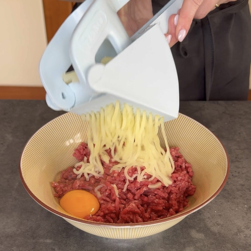 then add the breadcrumbs and mix well to have a compact mixture and make sure the breadcrumbs blend with the meat.