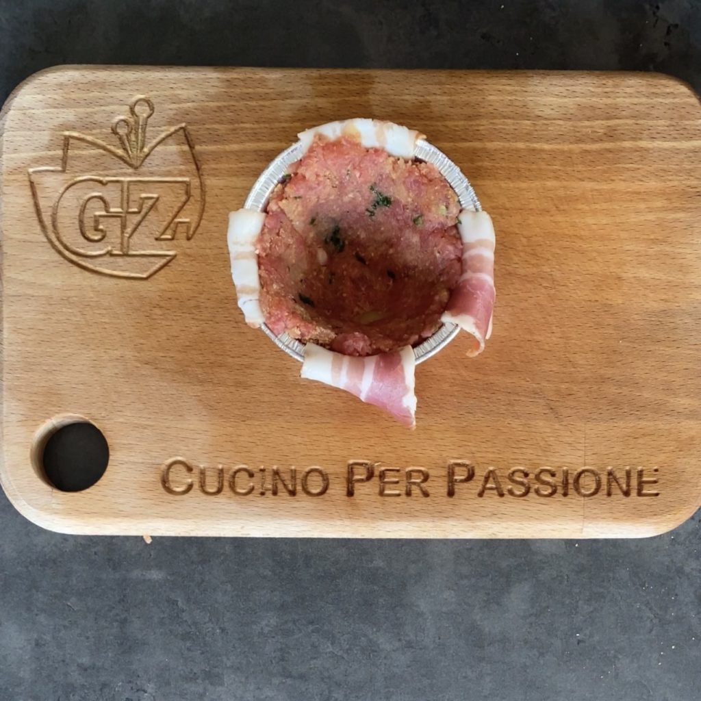Fold the slices of bacon over the minced meat and bake in a preheated static oven at 350°F for 30 minutes.