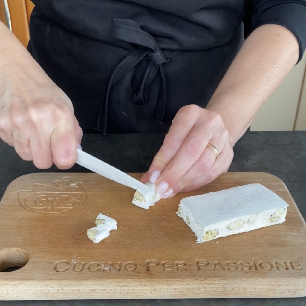 Nougat Semifreddo, a delicious Christmas dessert, easy to make and very tasty. I serve it with melted dark chocolate. Alternatively, you can also add pistachio cream or chopped nuts. This egg-free nougat semifreddo was prepared for this year’s Christmas celebrations, and I have a good stock in the freezer so that if guests arrive at the last minute, I can take out the individual portions and serve them if I don’t have any other dessert ready. In past years, I always prepared the NOUGAT AND COFFEE SEMIFREDDO, also very good, and unlike this one, it doesn’t have condensed milk but eggs. The nougat semifreddo with mascarpone is creamy, and you just need to take it out half an hour before serving it to enjoy it at its best. I recommend looking at my nougat recipes and saving the SPECIAL COLLECTION OF CHRISTMAS RECIPES among your favorites. You’ll find fantastic recipes of all kinds, from appetizers to desserts, meat and fish dishes, in short, for every need. Now let’s see how to make the nougat semifreddo, and if you try it, let me know. Barbara