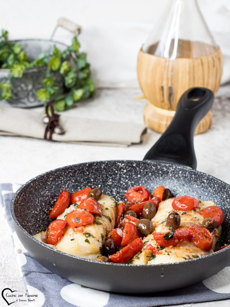 Pan-fried cod with cherry tomatoes is a simple, delicious main course that is very easy and quick to prepare, remaining tender and succulent. Cod fillets cooked in a pan with cherry tomatoes and olives are perfect if you have little time to dedicate to cooking as they are prepared quickly. You can use either fresh or frozen cod fillets. I also recommend trying the VENETIAN SALTED COD RECIPES that are traditional from my Veneto region and other recipes with EASY AND QUICK COD FILLET RECIPES. Now let’s see how to make Pan-fried cod with cherry tomatoes and let me know if you try it. Barbara