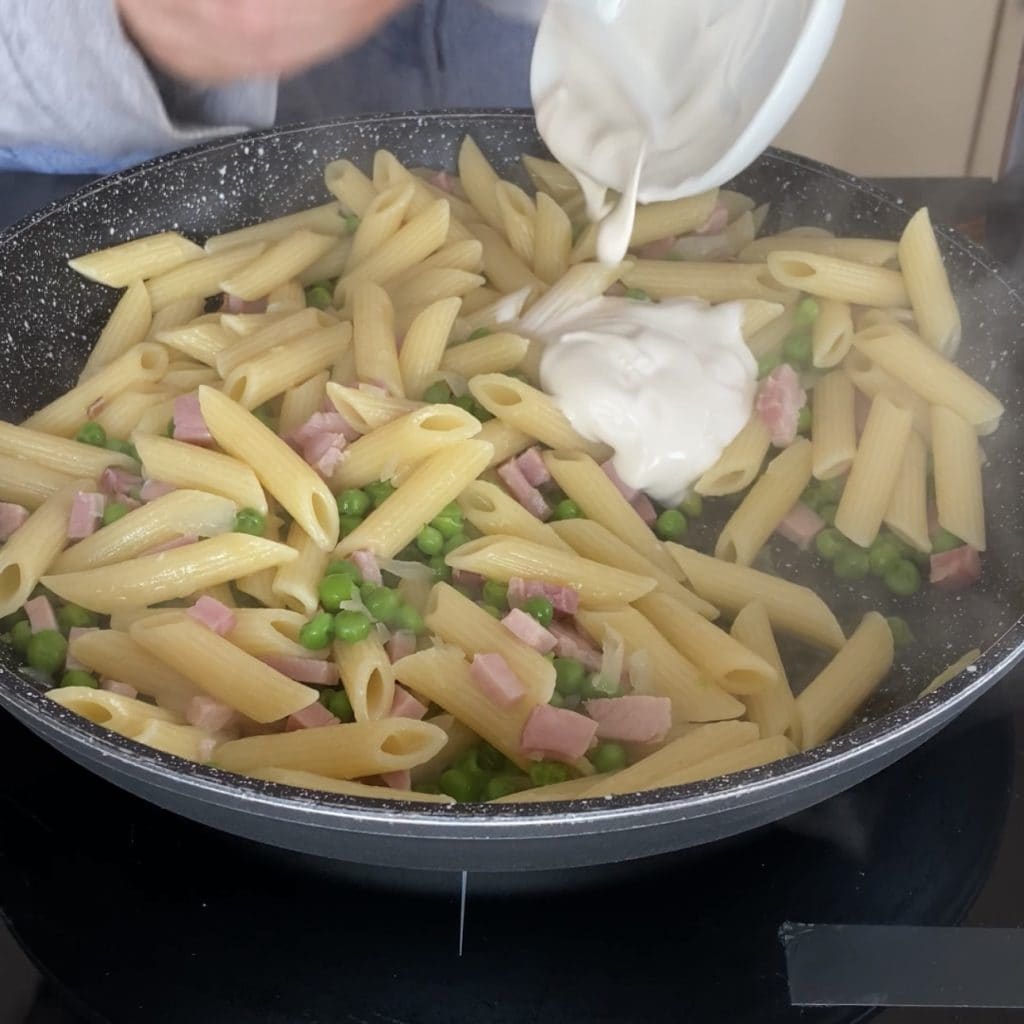 When the pasta is cooked, pour it into the pan with the peas and cooked ham,