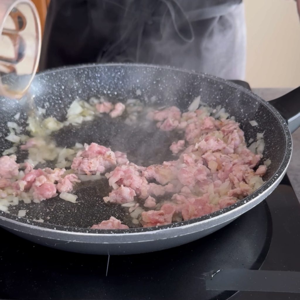 then remove the casing from the sausage and crumble it directly into the pan with the onion.