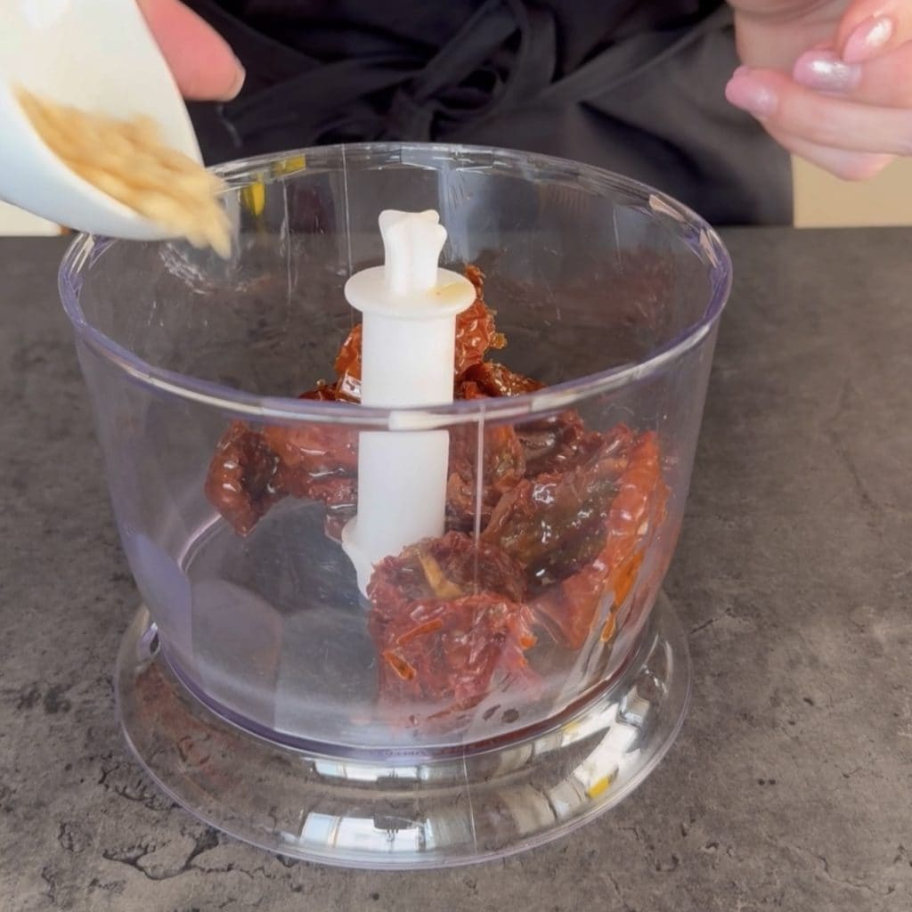 • Let’s start preparing the pasta with tuna and sun-dried tomatoes. Pour the sun-dried tomatoes, from which you have removed the oil, into the blender glass,