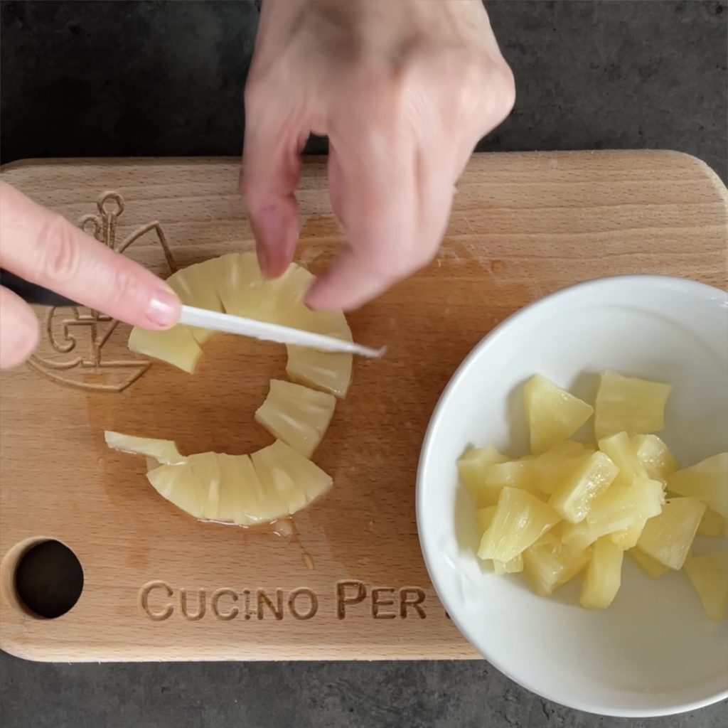• Let’s start making the pineapple and yogurt cake by preparing the pineapple. If using fresh, peel it, remove the hard core, slice it, and then cut into small pieces. Place it in a bowl and save the juice that forms during cutting. Add 3 tablespoons of sugar and let it rest. If using canned pineapple, pour the juice into a bowl, cut the slices into pieces, and store in a small bowl.