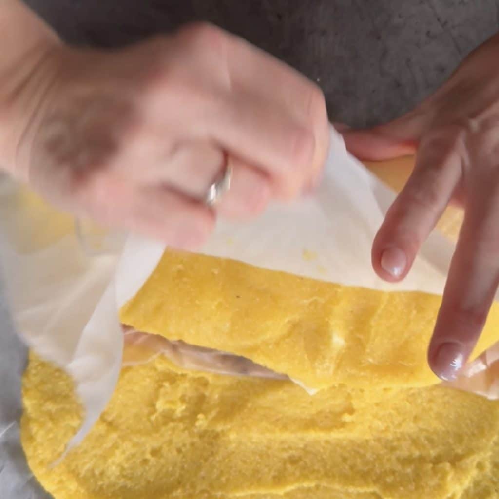 • Bake in a static oven at 356°F for 20 minutes. Midway through, open the roll to brown the top of the polenta. Once cooked, remove from the oven, remove the parchment paper from the top, flip the loaf pan onto the serving plate, remove the remaining parchment paper, slice it, and serve hot.