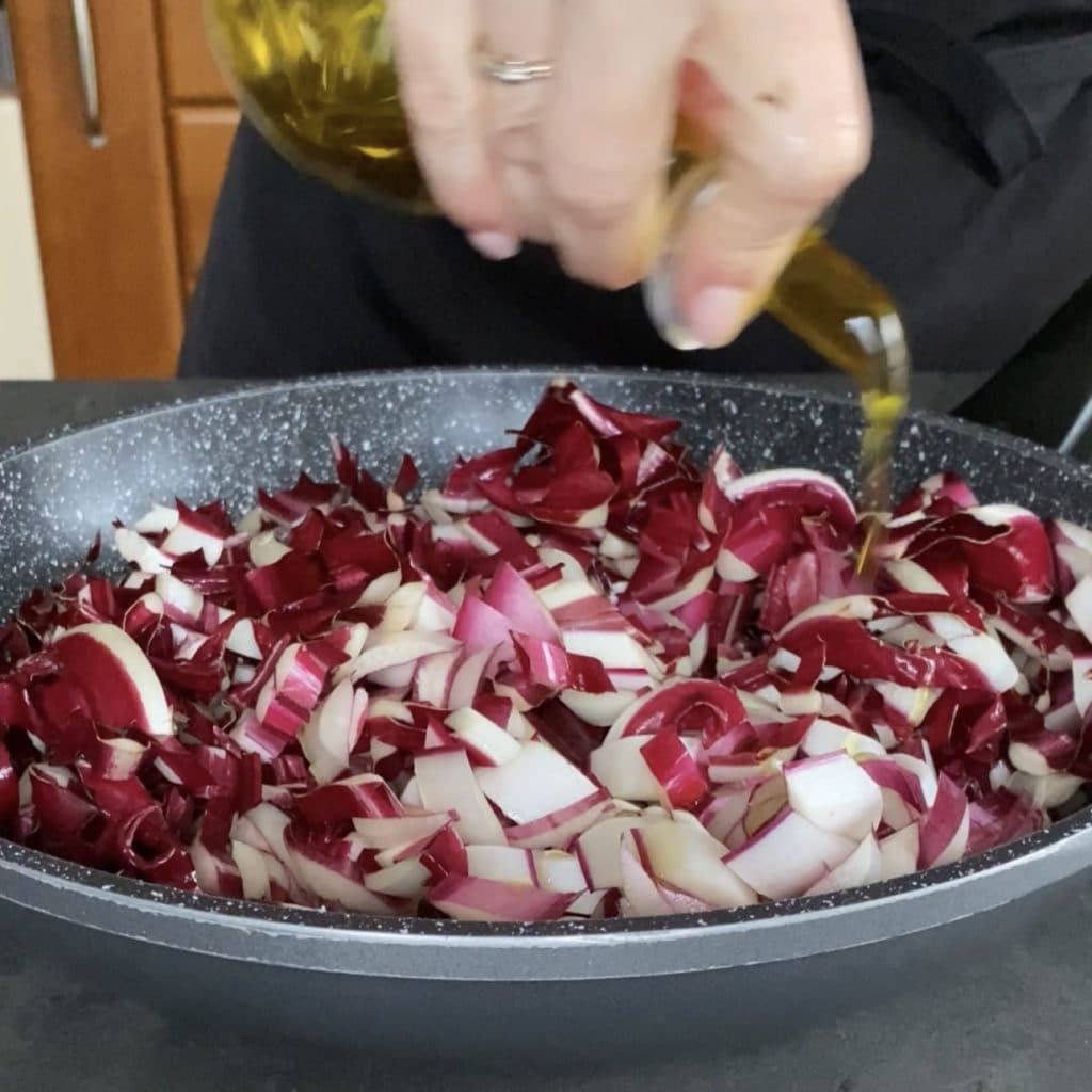 • Let’s start making the polenta roll with radicchio, speck, and cheese. First, prepare the radicchio, clean the onion, chop it finely, and place it in a large pan.