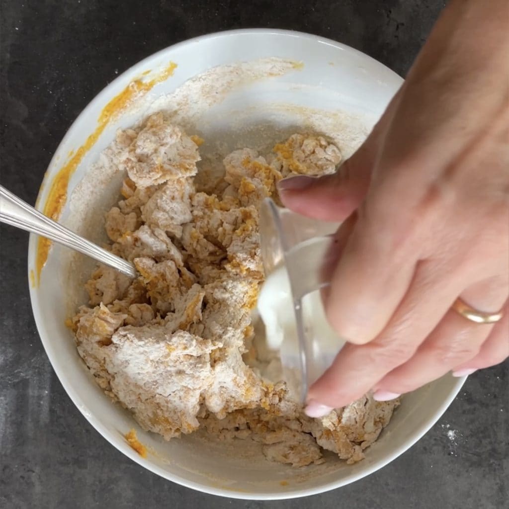 • Let’s start preparing the Pumpkin Muffins by cooking the pumpkin in the oven or air fryer as advised above. Once the pumpkin is cooked, scoop out the pulp and place it on a plate, mash it with a fork to obtain a puree.