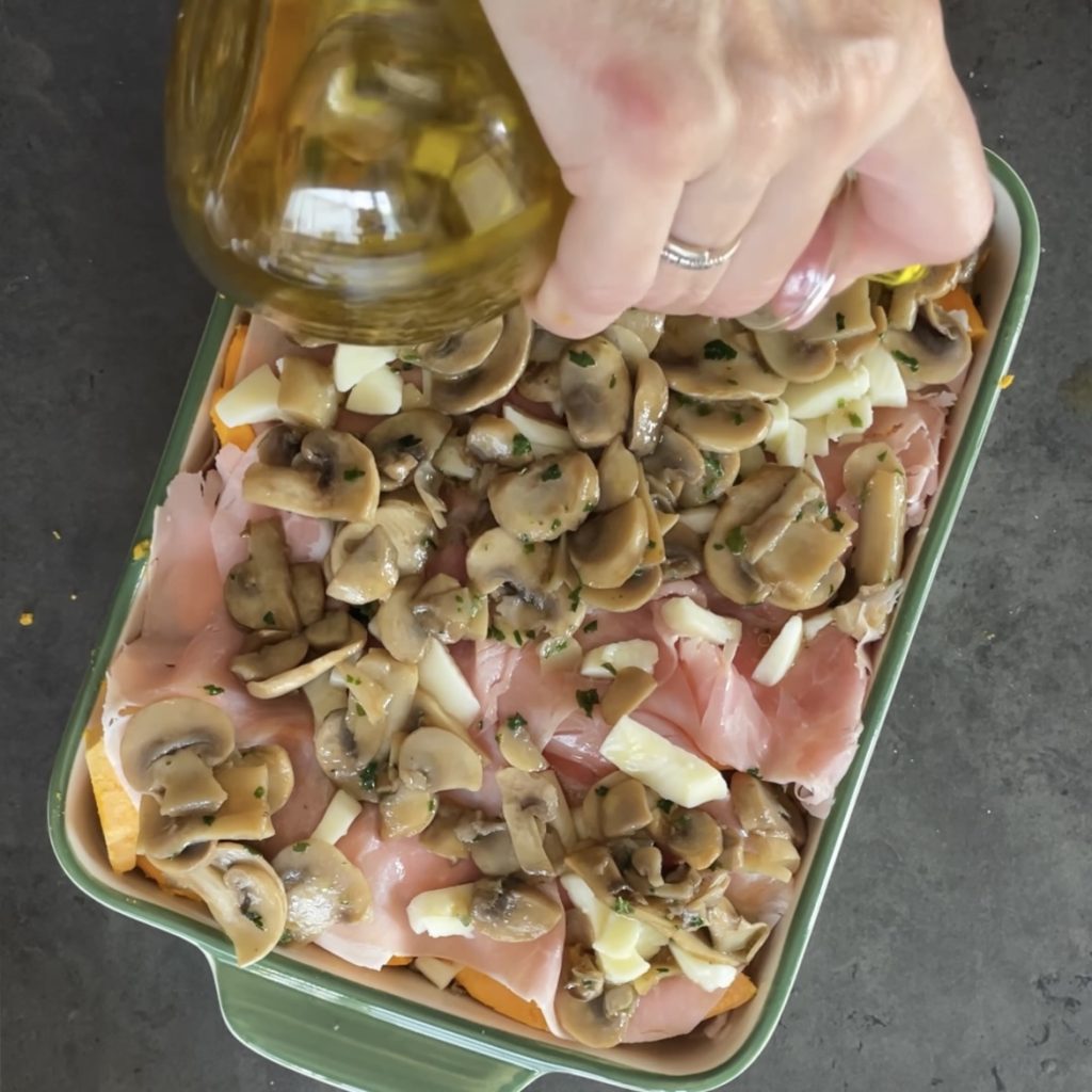 The last layer will be with ham, mozzarella, and mushrooms.