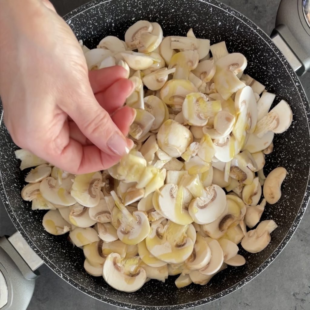Let’s start preparing the pumpkin casserole, clean the mushrooms, wash them quickly under running water, and slice or chop them into small pieces, then add them to a pot,