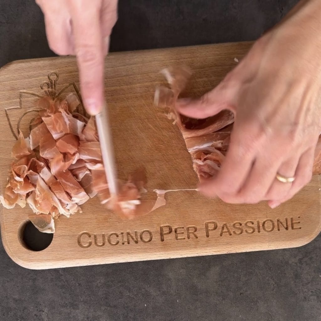 When the focaccia with speck and mushrooms is ready, take it out of the oven, slice it, and serve it very hot.
