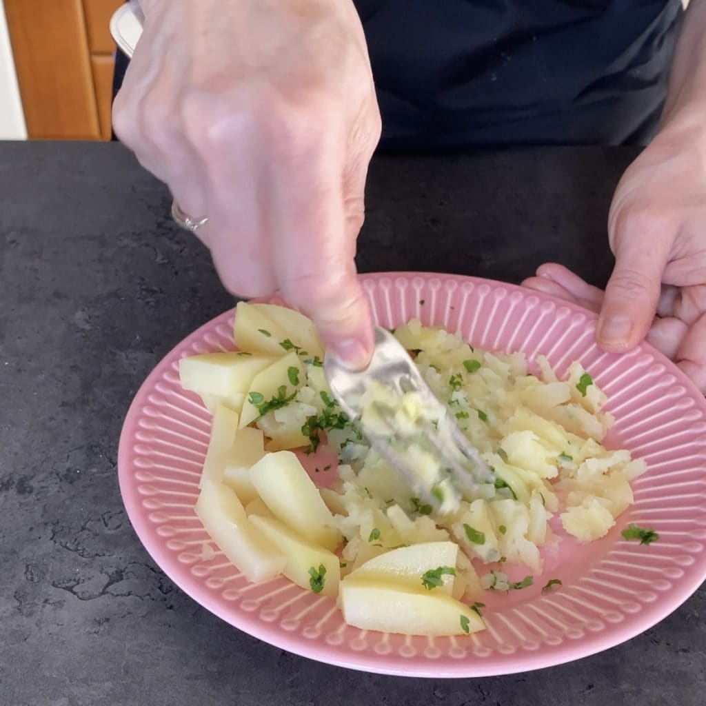 • Boil the potatoes and cut them into pieces, place them on a plate, and add chopped parsley.