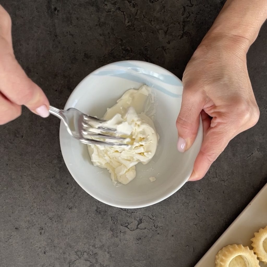 Now prepare the filling cream, place the cream cheese in a bowl, and work it with a fork until you get a smooth cream.
