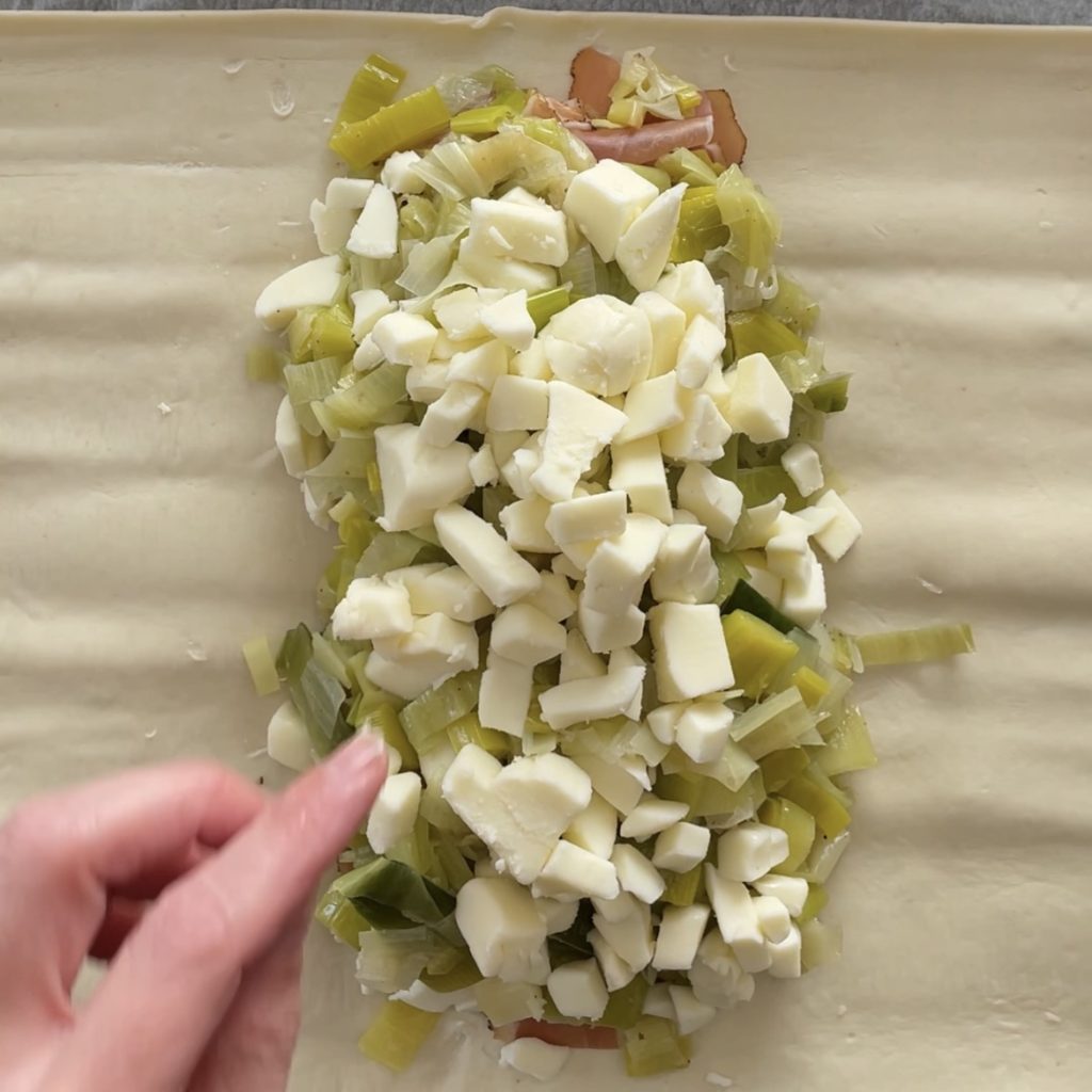 • Unroll the puff pastry, keeping the longer side towards you, place some of the speck in the center, and set aside 6/7 slices to cover the filling later.