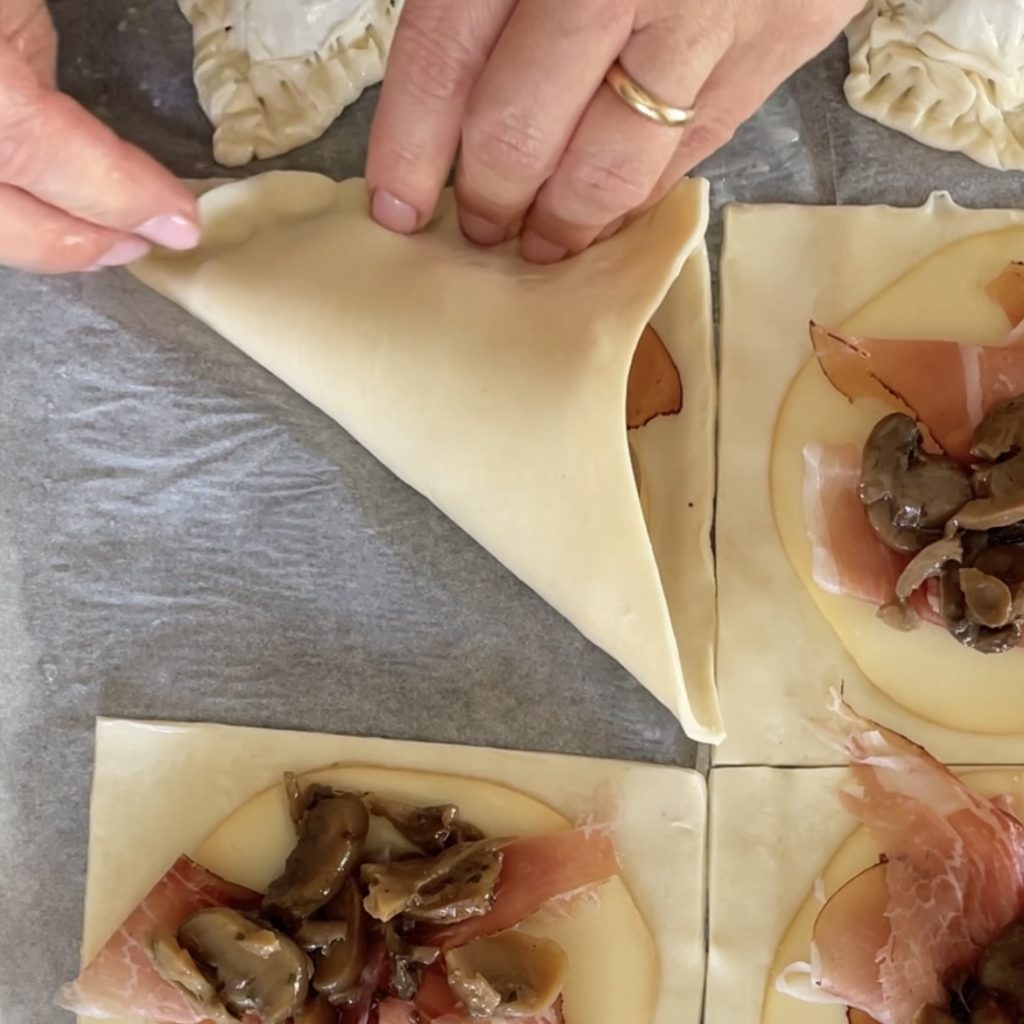 I recommend consuming the savory snacks with mushrooms and speck on the same day to savor the crispness of the puff pastry. The next day, the puff pastry will be more rubbery and not flaky.