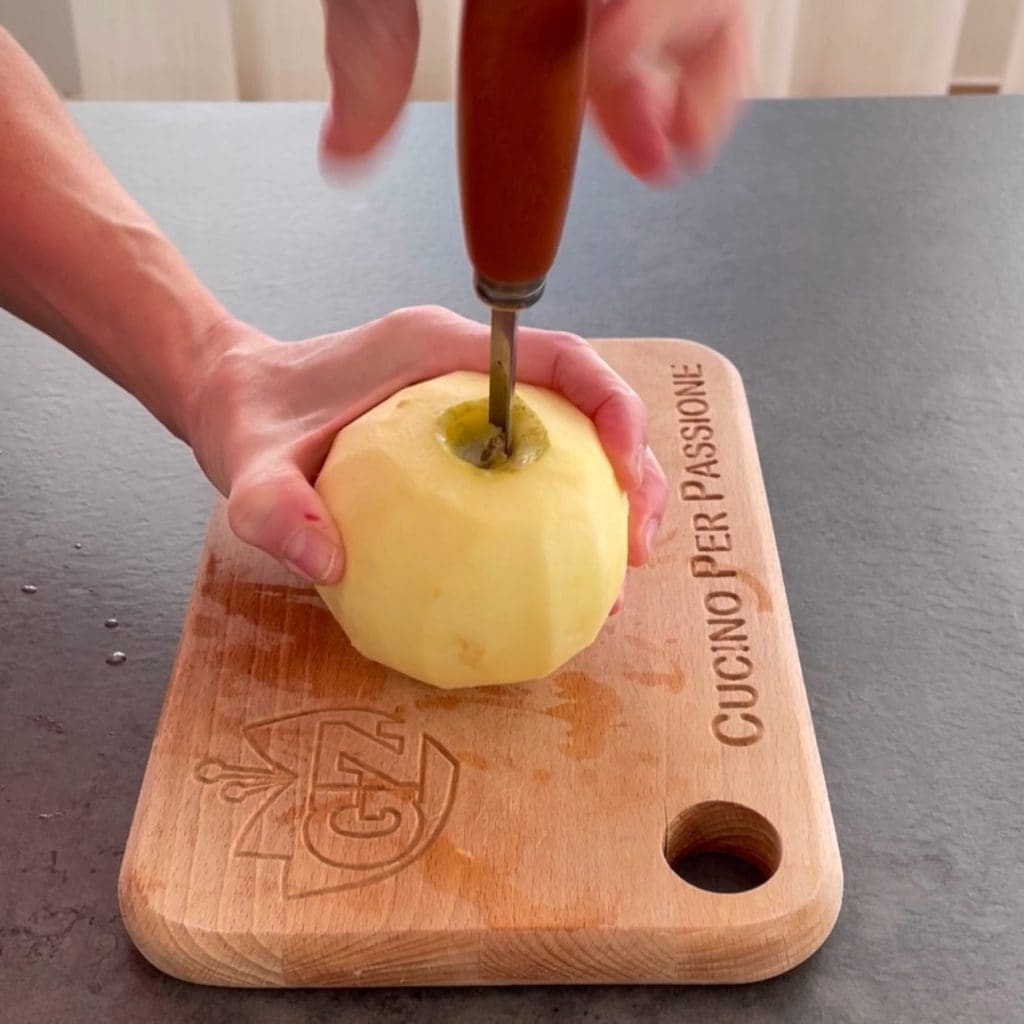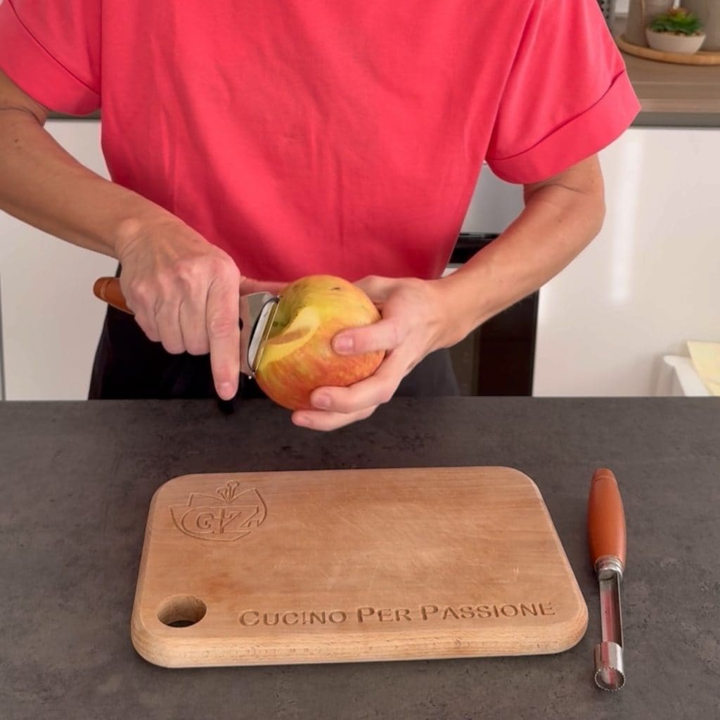 • Let’s start preparing sliced apples with puff pastry, peel the apple,