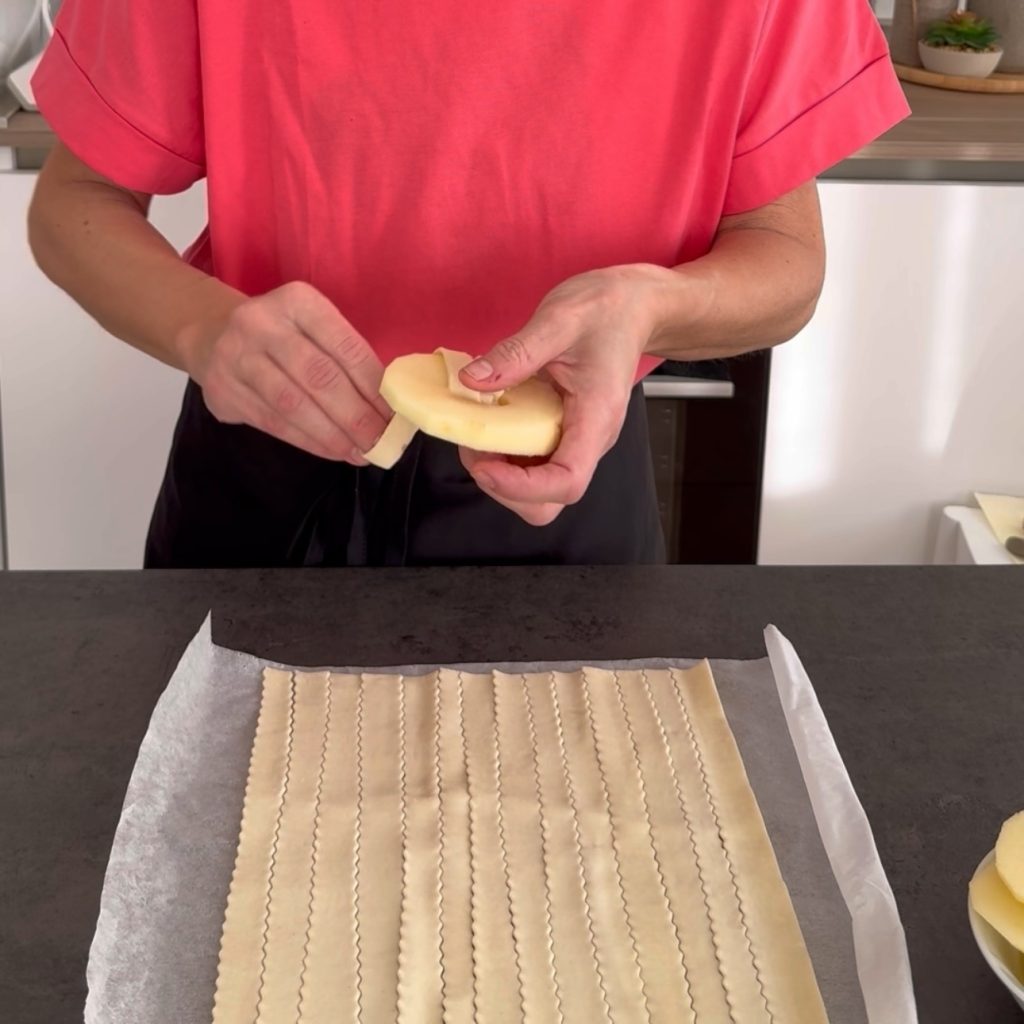 • As you cover the apple slices with puff pastry, place them on the baking sheet and sprinkle with sugar,