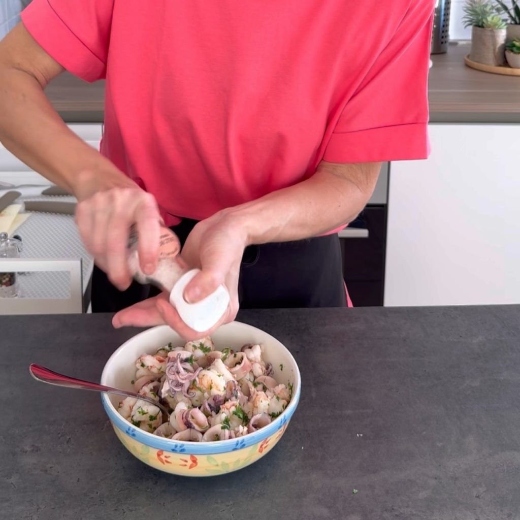 • Let’s start preparing the squid and shrimp salad, clean the squid from the innards and remove the cartilage found on the back of the squid by simply pulling it out. Use a knife to remove the beak and eyes. Rinse the squid under running water, detach the tentacles and cut the squid body into rings.