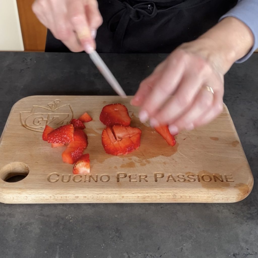 • Clean the strawberries, remove the leaves, wash them and cut them into pieces,