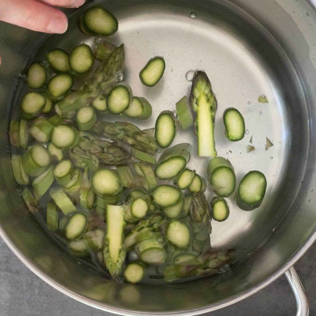 Wash the green asparagus, remove the tough ends, cut off the tips and halve them lengthwise — they will be used later for the final decoration. Slice the asparagus into rounds, preferably on the bias.