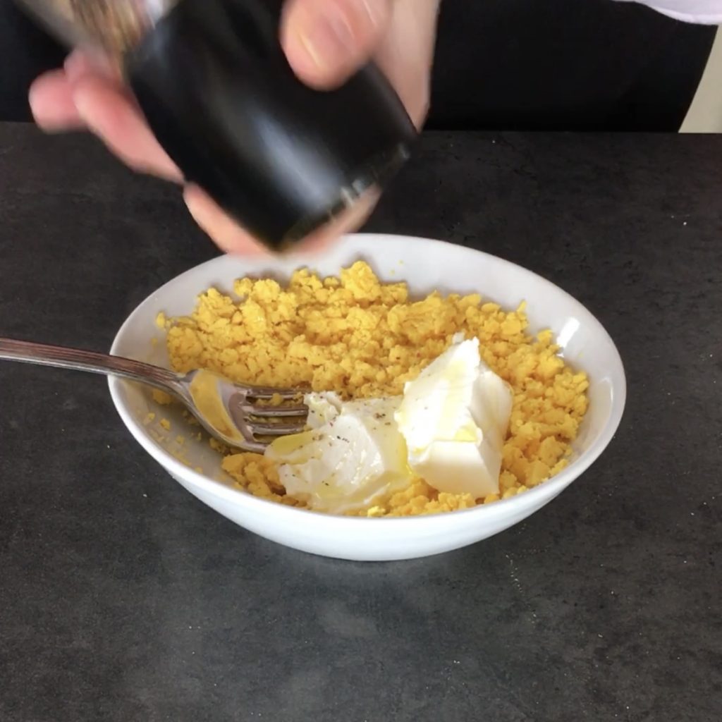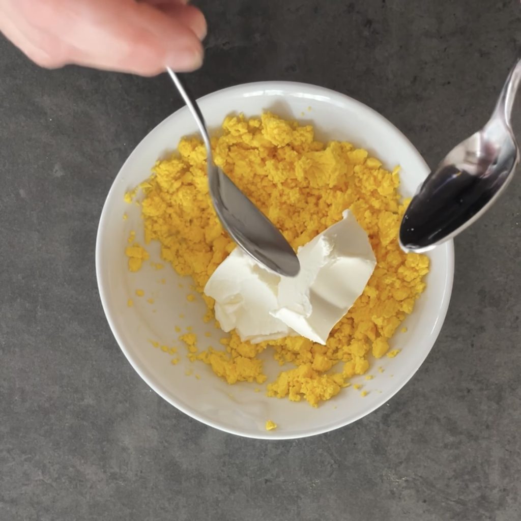 Set aside one tablespoon of crumbled yolk to use later for decoration.