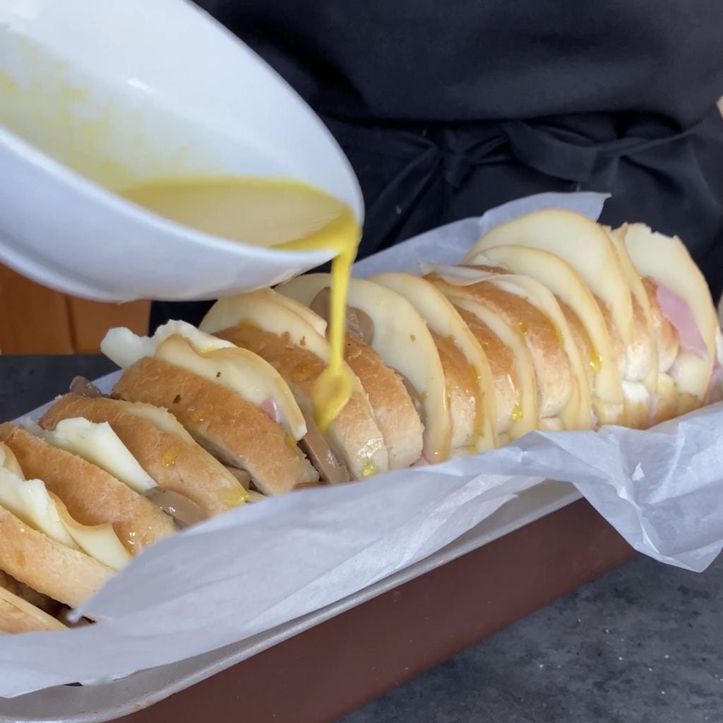 Pour the remaining milk and eggs over the bread to let it soak in between the stuffing.