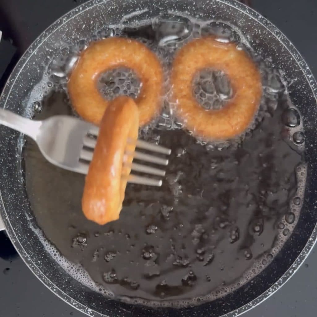Now pour the peanut oil into a pot and bring it to a temperature between 338–356F°, if you don’t have a thermometer, use the handle of a wooden spoon to test it; if bubbles form around it, the temperature is perfect for adding the first donut. Take the parchment paper where the donut is placed and gently slide the donut into the oil; the donut will detach from the paper on its own. Remove the paper and let the donuts cook, do not cook too many at once.