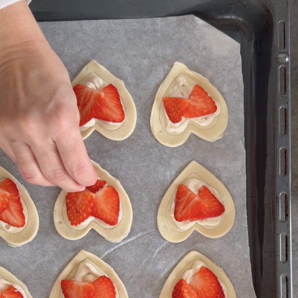 • Unroll the puff pastry and use a cookie cutter to cut out hearts,