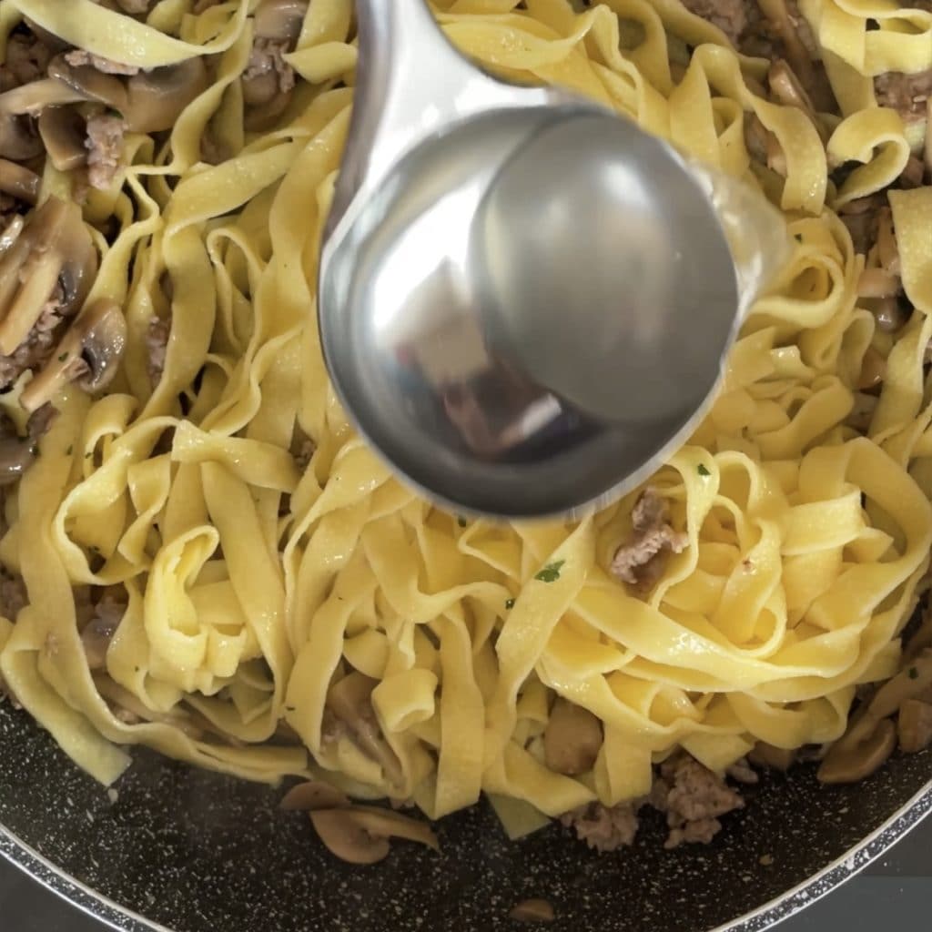 Add the tagliatelle to the pan with mushrooms and sausage,