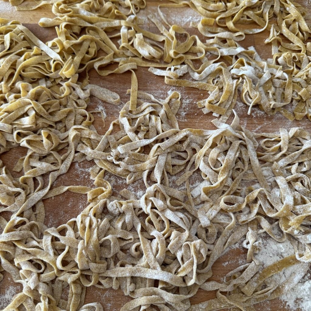If using the pasta machine, pass a flattened piece of dough through the rollers at width 5 – 6 until bubbles appear in the dough, a characteristic sign of pasta. Fold it and pass it through again; it will become smooth and uniform. Continue tightening the rollers and passing the strip of dough several times until you reach the desired thickness. Finally, pass each sheet through the attachment that forms the tagliatelle and arrange them on a floured surface so they don’t stick together or place them in a pasta drying rack.
