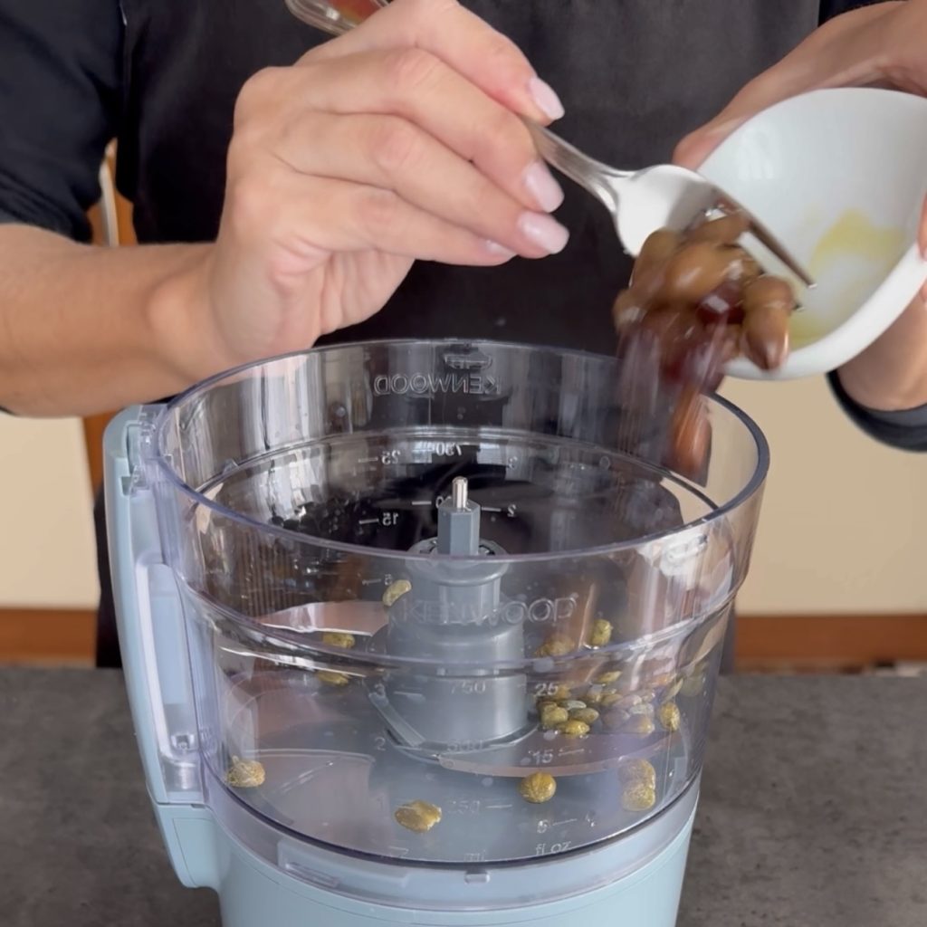 • Let’s start preparing the tuna and vegetable sandwich rolls by placing the capers in the chopper cup,