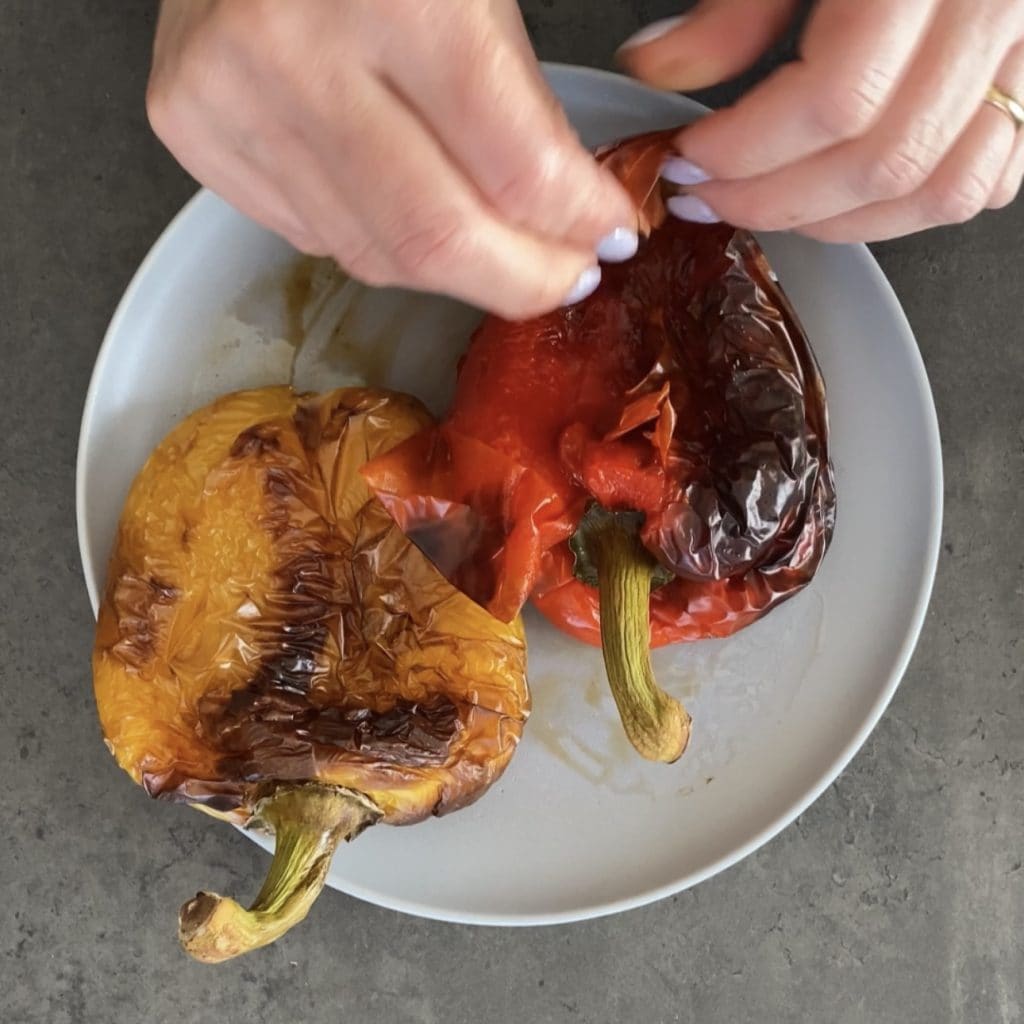 When they are ready, turn off the air fryer and let them rest in the fryer basket for 15/20 minutes. This step will make it easy to peel the peppers. If you want to bake them instead, preheat the convection oven to 356°F and when it’s hot, insert the peppers and cook them for about 40 minutes, then put them still hot in a food bag, close it and let rest for 10 minutes. Once you have cooked the peppers, peel them,