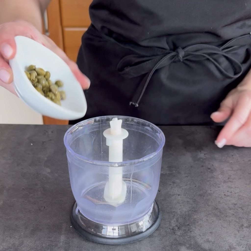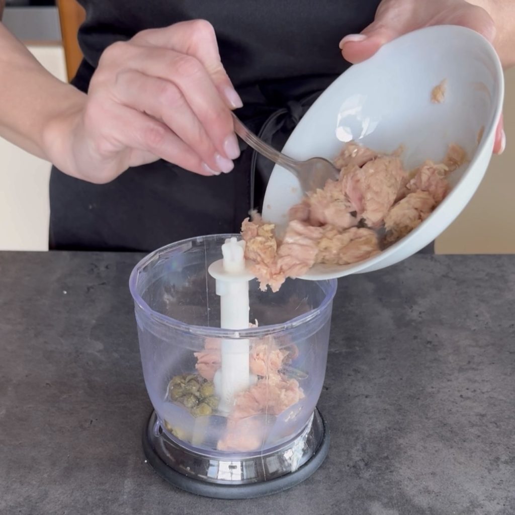 blend until you get a creamy and not too thick sauce. If you want a less creamy but more coarse sauce, you can skip blending the tuna and mash it with a fork, then add it to the mayonnaise, capers, and anchovy sauce.