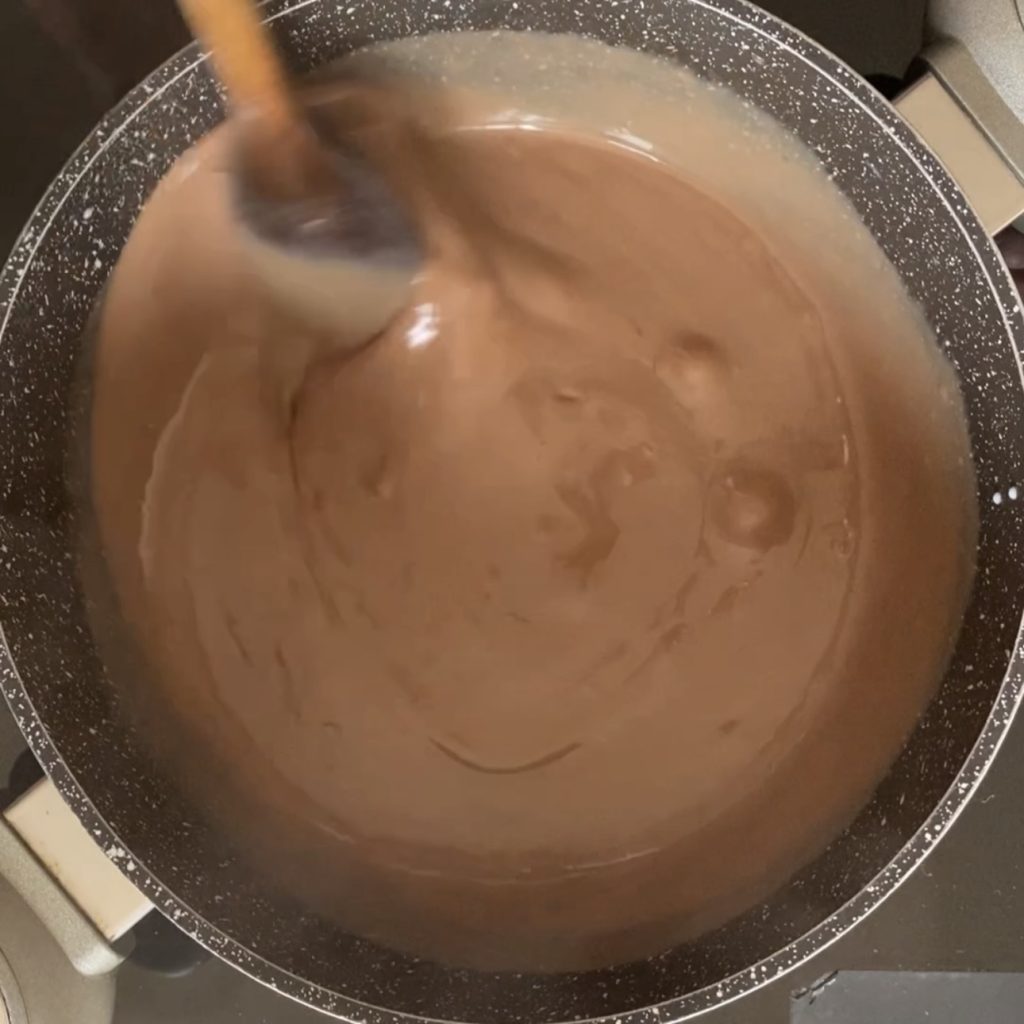 Place over heat, stirring continuously to prevent sticking to the bottom. When it’s hot but still liquid, add the milk chocolate,