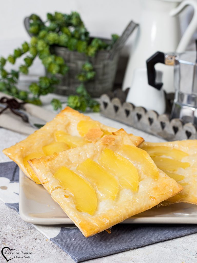 Let’s start preparing the upside-down apple puff pastries. Cut the puff pastry into 6 rectangles and prick them with the tines of a fork. Peel the apple, cut it into 4 quarters, remove the core, and slice into pieces about 1/4-inch thick.