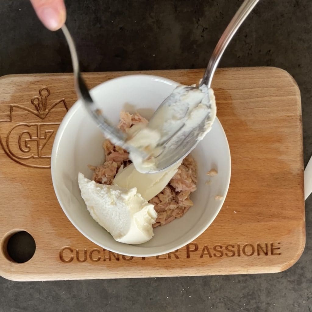• remove the oil from the tuna and pour it into a bowl, add the ricotta