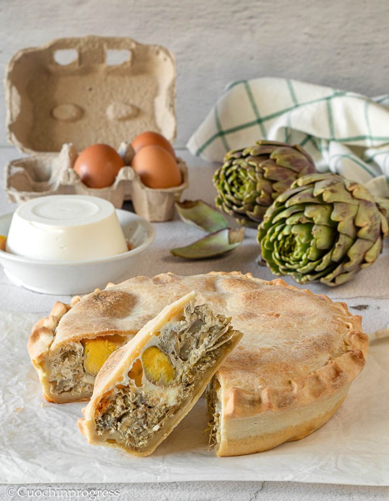 The ARTICHOKE PASQUALINA PIE is an explosion of colors and flavors: a crispy layer of dough encases a soft, creamy center, enriched by the taste of artichokes, eggs and ricotta.