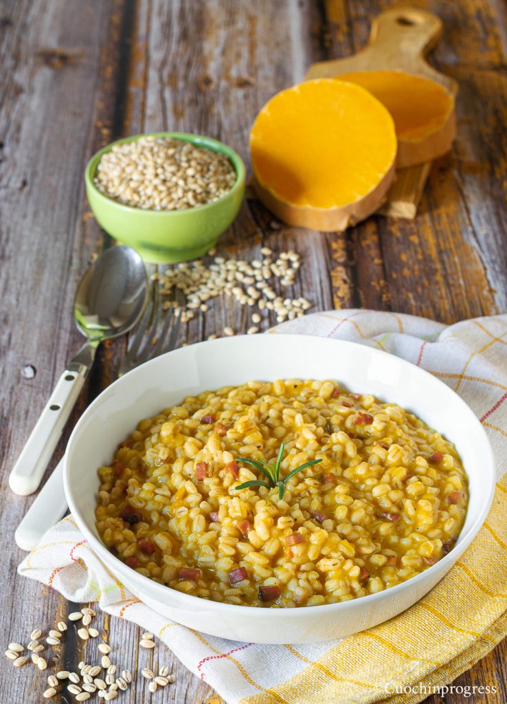 The dish is based on a very particular balance between tastes and textures: the sweetness of the pumpkin contrasts with the savouriness of the speck, while its creaminess, enhanced by Parmesan, clashes with the firmness of the pearled barley, with its enjoyable chewiness. In addition, I assure you, the smoky aroma of the prized South Tyrolean cured meat and the scent of rosemary complete the dish wonderfully. The orzotto is prepared like a classic traditional risotto and, precisely for this reason, does not require particular attention, except for slightly longer cooking times to achieve a perfect result.