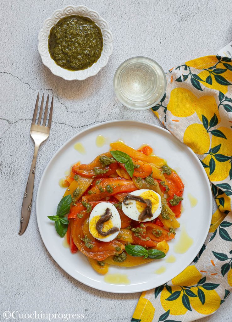 Cook the eggs starting from cold water: once the water comes to a boil, cook for 8 minutes. Drain them into cold water to stop the cooking and peel them.Arrange a nest of pepper strips on each plate, drizzle with pesto and add a hard-boiled egg. Place two anchovy fillets on the egg and finish your bell pepper, anchovy and hard-boiled egg salad with a drizzle of olive oil and fresh basil.