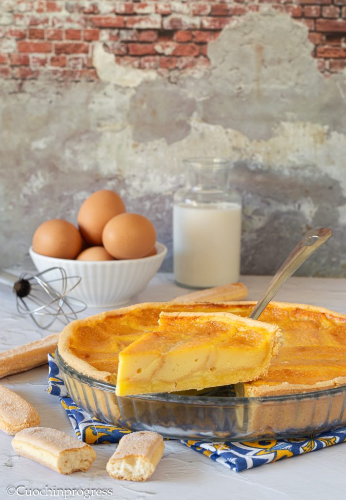 The BENEVENTANA TART, also known as the Portuguese cake, is a little-known dessert typical of the city of Benevento. With a crisp outer crust and a soft, creamy filling, it is a delicate and very indulgent dessert that wins you over at the first bite. The dessert consists of a classic lemon-flavored shortcrust pastry, ladyfingers and a fragrant liquid cream made from milk and eggs.