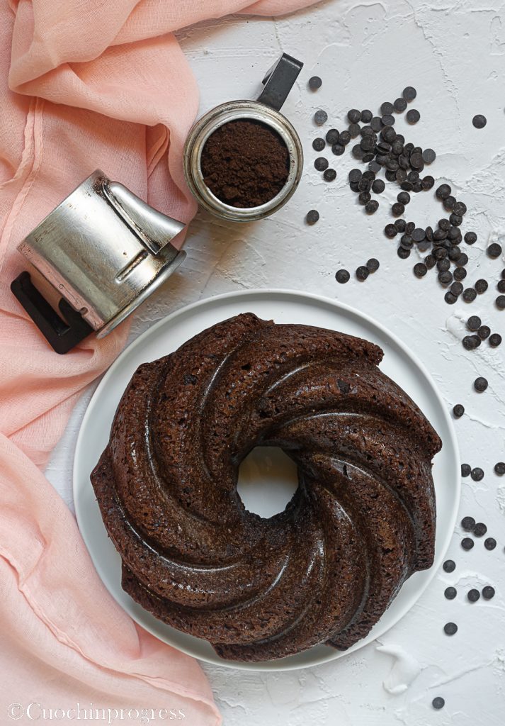 The preparation of the BUNDT CAKE CHOCOLATE AND COFFEE is very easy. First, prepare a moka of coffee and let it cool; you’ll need it cold.